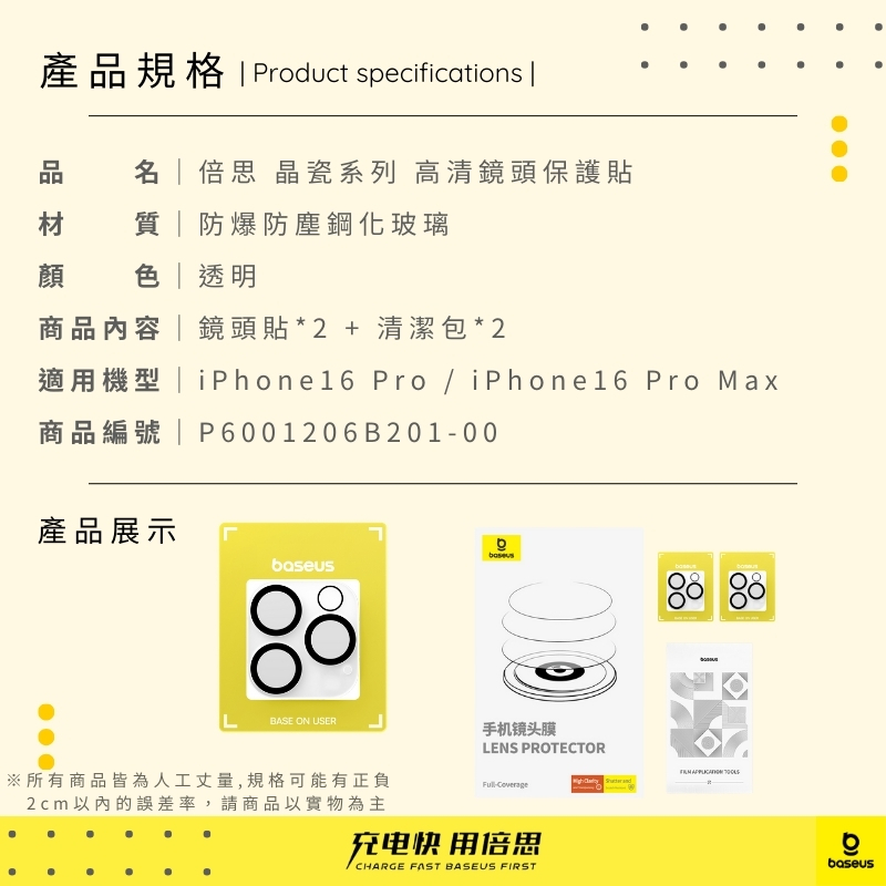 【倍思】晶瓷系列 i16 Pro / i16ProMax 高清鏡頭貼 雙片裝 鏡頭膜 (P6001206B201-00)